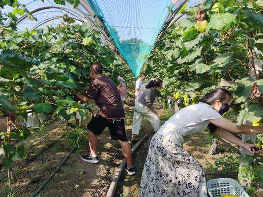 活动当天虽然气温偏高,但大家依旧兴趣盎然。在采摘园里,工作人员准备了葡萄给老师们品尝。阳光玫瑰、巨峰、金田玫瑰、沈农皇后等,在品尝了多个葡萄品种不同口味的鲜甜后,老师们沿着葡萄长廊来到各个葡萄园,大家一边采摘一边交流,动手的快乐和话语间的喜悦,让种植棚中笑声不断,气氛热烈。经过半个小时的采摘,大家手中的果篮也都已装满,每个人带着自己的劳动成果,高兴地走出葡萄园,结束了今天的采摘之旅。