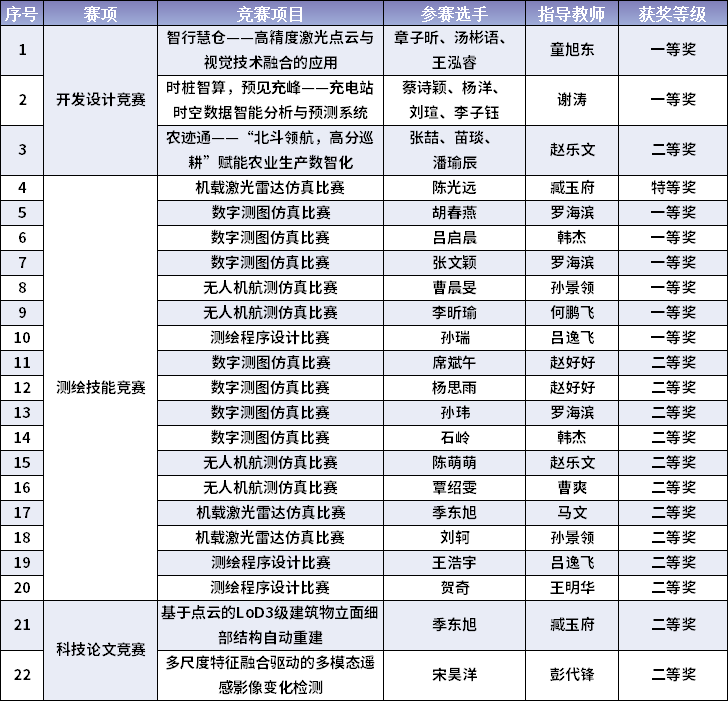 8月15日,2025年全国大学生测绘学科创新创业智能大赛获奖通报发布,我校获得专业组22个奖项,其中特等奖1项、一等奖8项、二等奖13项,获奖数量位居专业组江苏省参赛高校第一名,臧玉府老师获得“优秀指导教师”称号。