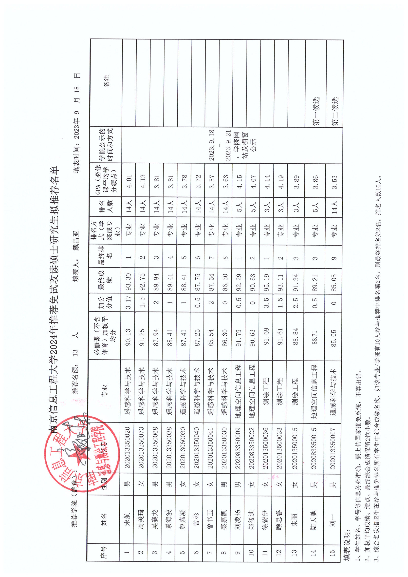 南京信息工程大学2024年优秀应届本科毕业生免试攻读研究生拟推荐名单公示