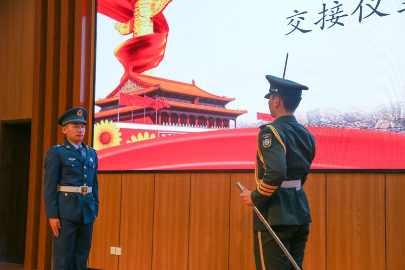 会上新任队长沈周宇与上任队长曹宇进行了交接,同时表态将带领国旗护卫队继续做好本职工作,铭记国旗护卫队誓词,更以全新的面貌展现国旗护卫队的风采。