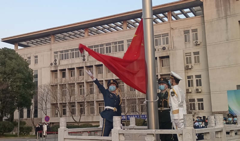 7:00升旗仪式准时开始,英姿飒爽的国旗护卫队伴随着军乐的铿锵节奏,迈着矫健的步伐,升旗手沈园皓,护旗手刘奕、韩佳兴在指挥员陈宇的口号下,带领海陆空三军的队员们迈着整齐划一的步伐向升旗台前进。在高亢、激昂、嘹亮的国歌声中,鲜艳的五星红旗徐徐升起,飘扬在南信大上空,飘扬在每个人的心中,沿途的师生们纷纷停下脚步向国旗行注目礼。