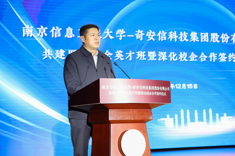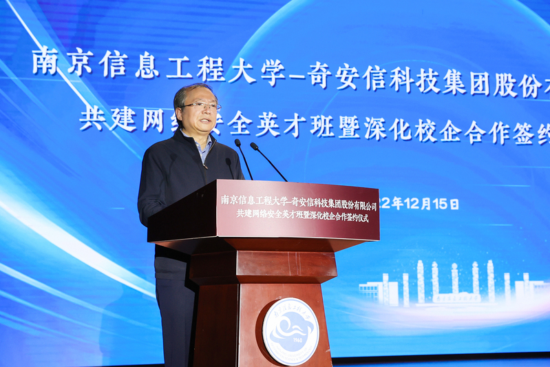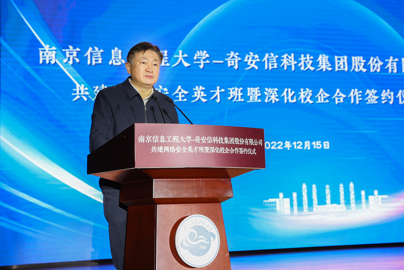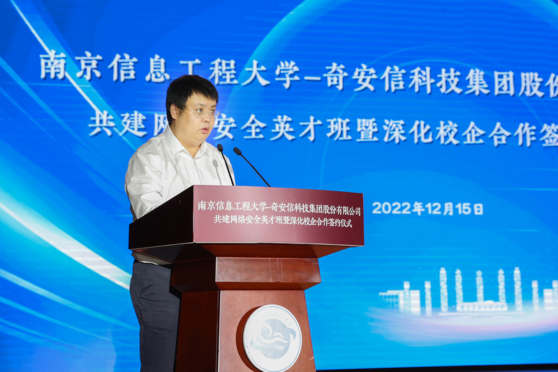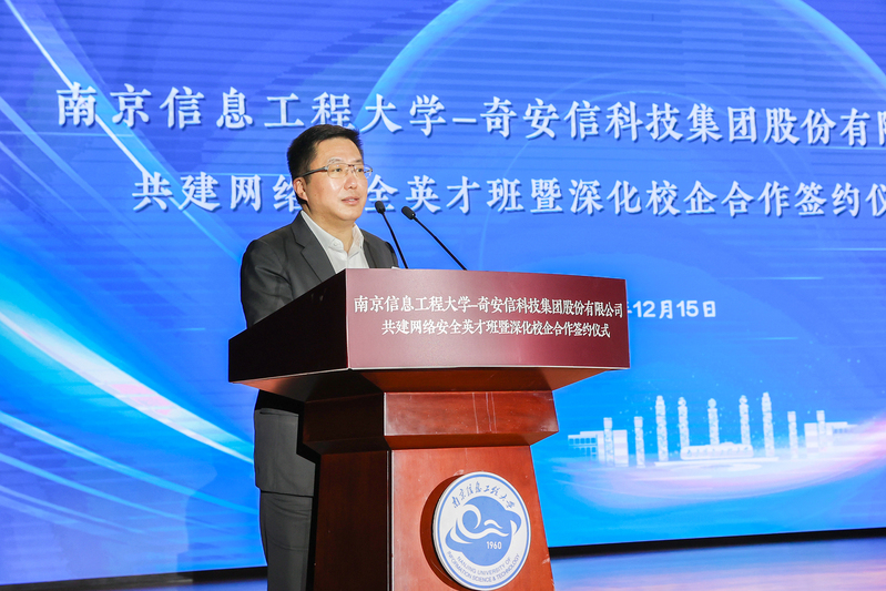 管兆勇致欢迎辞。他首先对与会领导、专家的到来表示热烈的欢迎,向长期以来对南信大事业发展给予的关心、支持表示感谢,并简要描绘了学校未来学科的发展愿景。他说,我校大气科学学科是国家“世界一流学科”建设学科,位居世界排名前列。近年来,学校通过体制机制创新,构建“气象+”“+信息”的多学科协调发展新局面,其中地球科学和计算机科学进入ESI全球排名前1‰,与网络安全息息相关的信息安全专业是省级品牌本科专业建设点、江苏省“十四五”重点专业,为社会培养了大批精英人才。他表示,学校积极探索分类多元的拔尖人才培养实践,重点开展信息工科拔尖人才培养模式的改革探索,先后开设“华为实验班”“腾讯实验班”“海康威视英才班”等,着重发挥校企优势,探索产教、科教双融合的发展路径。奇安信集团长期深耕网络空间安全市场,凭借持续的研发创新和以实战攻防为核心的安全能力,已发展成为国内领先的基于大数据、人工智能和安全运营技术的网络安全供应商。他希望,通过本次深入合作,双方能够突破传统路径,充分发挥各自优势,整合优质教育、行业和产业资源,布局未来网安人才培养,为网络强国建设提供坚强人才保障,更好地服务国家网络空间安全战略。