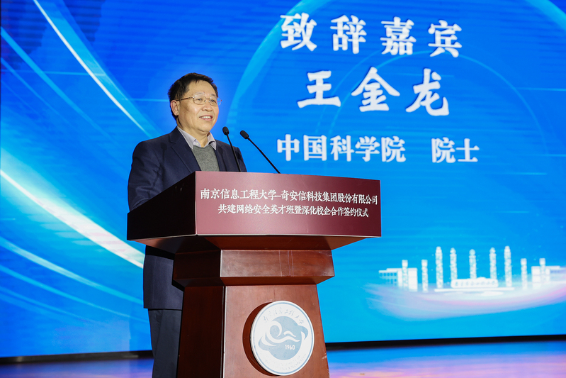 王金龙在讲话中代表中国人民解放军陆军工程大学对这次活动的成功举办表示祝贺。他说,南信大信息工科实力强劲,近年来重点开展了信息工科拔尖人才培养模式的改革探索,在探索产教、科教双融合路径上取得了显著成效。成立网络安全英才班是南信大在信息工程领域创新人才培养的又一重大举措。他希望双方进一步深化合作,通过强强联合共建网络安全英才班,积极打造网络空间安全领域的校企合作典范,培养一批批优秀的网络空间安全人才,助力国家网络空间安全事业的发展。