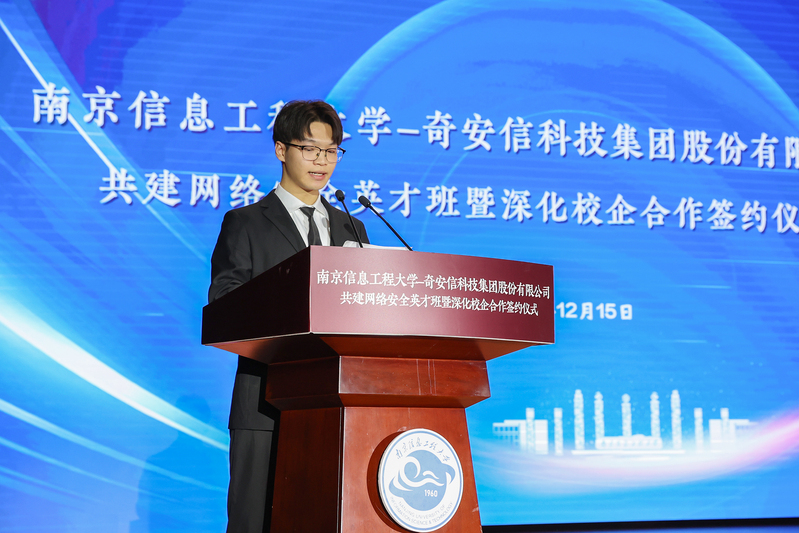 张家豪作为学生代表发言。他说,南信大是一所有文化底蕴有实力有温度的大学,校园环境优美,基础设施完善,给广大学生提供了良好的学习生活环境。作为一名新时代青年人,夯实专业理论知识,为护卫国家网络空间的安全贡献力量。