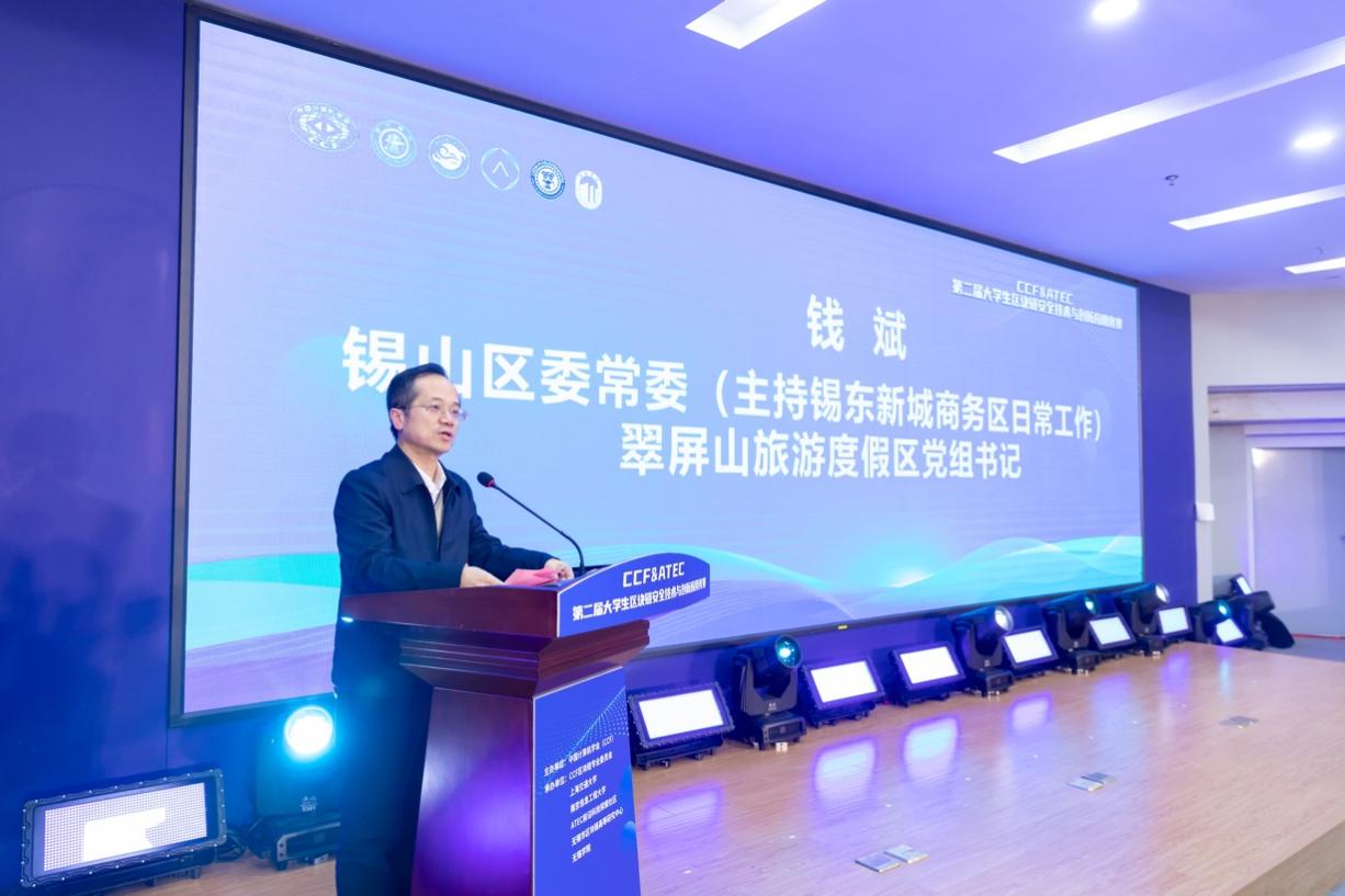 无锡市锡山区委常委(主持锡东新城商务区日常工作)、无锡翠屏山旅游度假区党组书记钱斌致辞。他指出,区块链是数字经济时代“新基建”的重要组成部分。锡东新城商务区深入实施创新驱动战略,不断集聚高端资源,构建具有区域竞争力和带动力的新经济产业体系,持续提升集成创新能力,是推动锡东新城高质量发展的重要举措,期待各位与会专家与选手将创新理念和技术应用在锡东新城,共同为锡东新城数字经济发展开辟广阔天地。