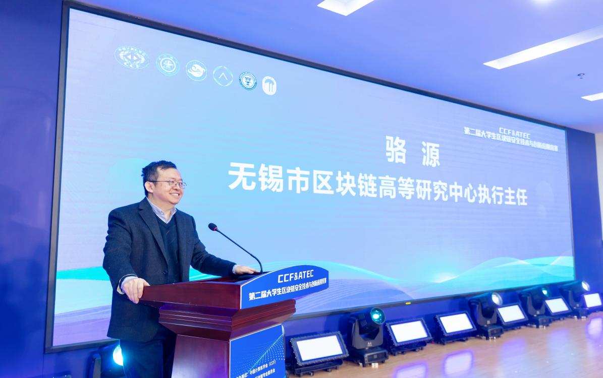 无锡市区块链高等研究中心执行主任骆源致辞,他首先介绍了无锡市区块链高等研究中心的发展现状,接着指出当前是国家区块链创新应用试点契机,重点发展的数字经济方面,围绕车联网、大数据、云计算、人工智能、Web3.0技术、芯片设计等领域导入了一批龙头型企业和隐形冠军,期待各位专家学生能扎根无锡,共同推动无锡区块链技术创新成果转化,推动自身和无锡快速前进。