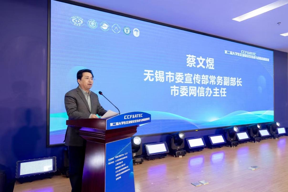 无锡市委宣传部常务副部长、市委网信办主任蔡文煜致辞,他首先介绍了目前国家区块链制度体系,总结了无锡市区块链技术体系发展现状与成果,指出要汇聚“政产学研用”多方优势、加快科技成果转化、推动区块链创新技术落户无锡、打造具有全国影响力的区块链创新应用之城,创出更多数字中国价值可信的“无锡样板”。