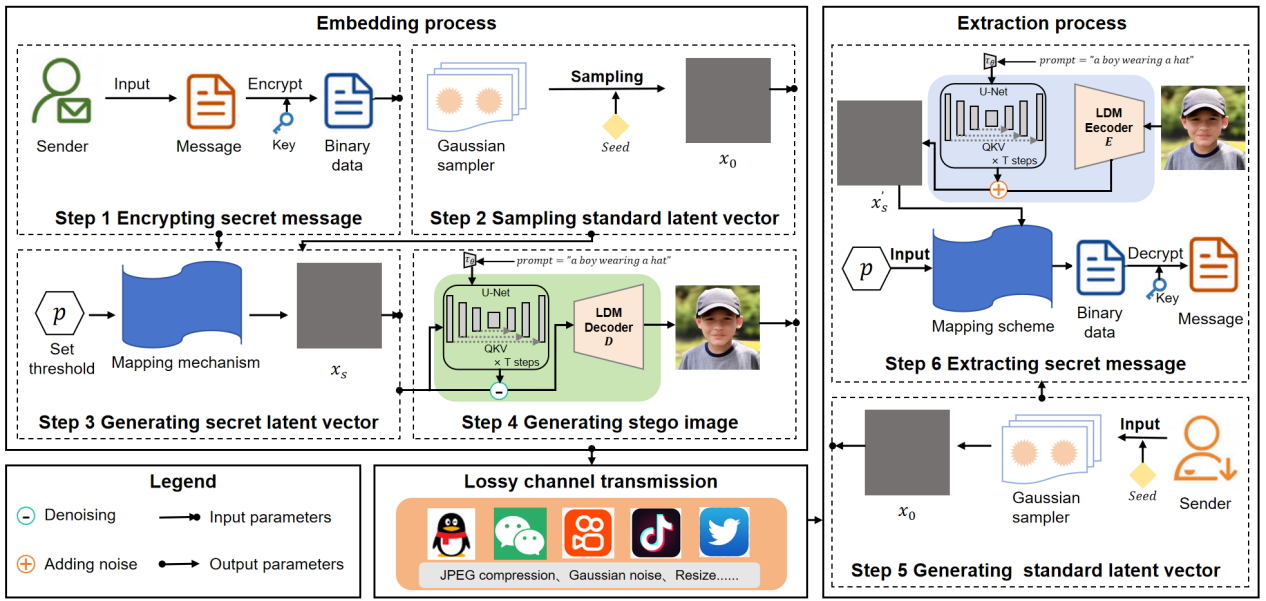 生成式图像隐写术是一种在生成模型生成图像的过程中隐藏秘密信息的技术。早期,人们使用生成对抗网络等生成模型来实现图像隐写任务,然而由于模型本身的限制,往往不能生成高质量的图像。近年来,扩散模型因其卓越的生成能力备受人们关注,研究者通过某种隐写算法将秘密信息隐藏到潜在向量中,进而将向量输入到扩散模型以生成隐写图像。但是目前存在的隐写算法往往会扭曲潜在向量的分布,导致生成的图像视觉质量偏低,容易引起第三方的怀疑,缺乏可证明的安全性。同时隐写图像经有损信道传输后无法以较高的准确率提取出秘密信息,鲁棒性较差,难以应用于现实场景。为了解决以上问题,本文提出了一种利用潜在扩散模型的新型隐写框架。首先通过主动探索潜在扩散模型的天然鲁棒性,得出一个一致性结论:图像在经受攻击后,其被扩散模型编码成的潜在向量中的符号基本上保持不变。基于这一发现,本文提出一种自适应分布保持机制,从而能够生成高质量的隐写图像,实现可证明安全。大量实验结果表明,所提方法在多种常见图像攻击下的鲁棒性表现均优于现有主流方法,同时在多种隐写分析工具的检测性表现出良好性能。