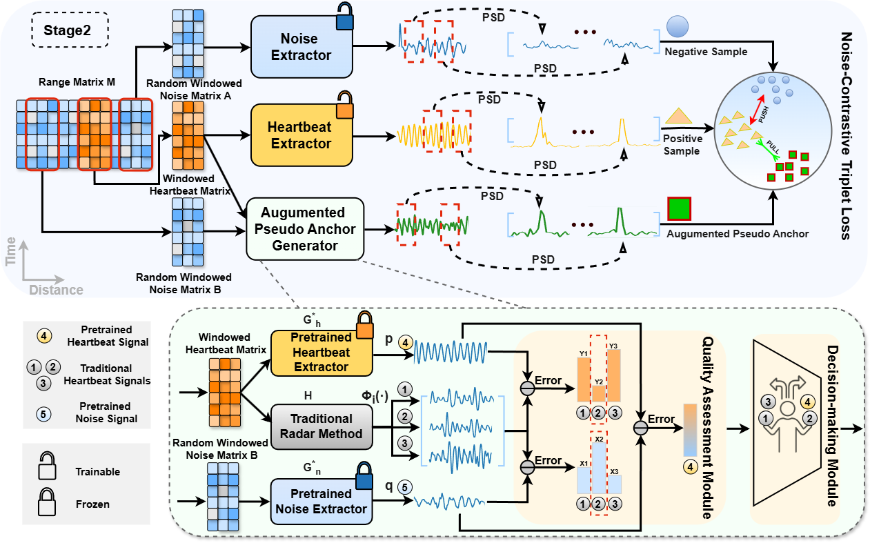 为此,本文提出了一个全新的无监督雷达心率感知框架 Radar-APLANC(Augmented Pseudo-Label and Noise Contrast),在完全不使用 PPG / ECG 等生理标签的前提下,让模型仅凭雷达数据就学会区分“心率信号”和“环境噪声”,并最终输出高质量的心搏波形和准确的心率估计。在 Radar-APLANC 中,不再把噪声当成“需要被过滤掉的垃圾”,也不把传统信号处理方法当成“落后的 baseline”。相反,将噪声显式地引入训练过程,作为对比学习中的负样本;同时,把传统方法产生的心率信号视作伪标签,通过精心设计的伪标签增强机制,从中筛选出对模型最有帮助的高质量监督信号。本文框架采用两阶段训练策略:第一阶段通过噪声对比学习快速让网络“看得懂心搏长什么样”;第二阶段利用增强伪标签生成器,从多种候选心率中自适应挑选最靠谱的一条,对模型进行进一步精修。