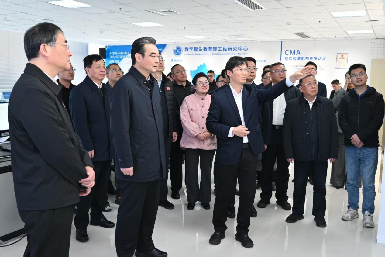 代表团一行重点参观了数字取证教育部工程研究中心。来宾们详细了解取证中心在电子数据取证、智能媒体安全、区块链存证等方面的研究方向、技术成果及应用场景。付章杰教授从平台定位、科研团队、代表性成果和社会服务等方面,系统介绍了取证中心的建设情况,重点展示了中心在网络安全、公共安全、司法取证等领域的技术突破和工程化应用案例,并就相关技术在企业信息安全防护、工业控制系统安全、无人机监管与取证等方面的潜在合作空间作了说明。