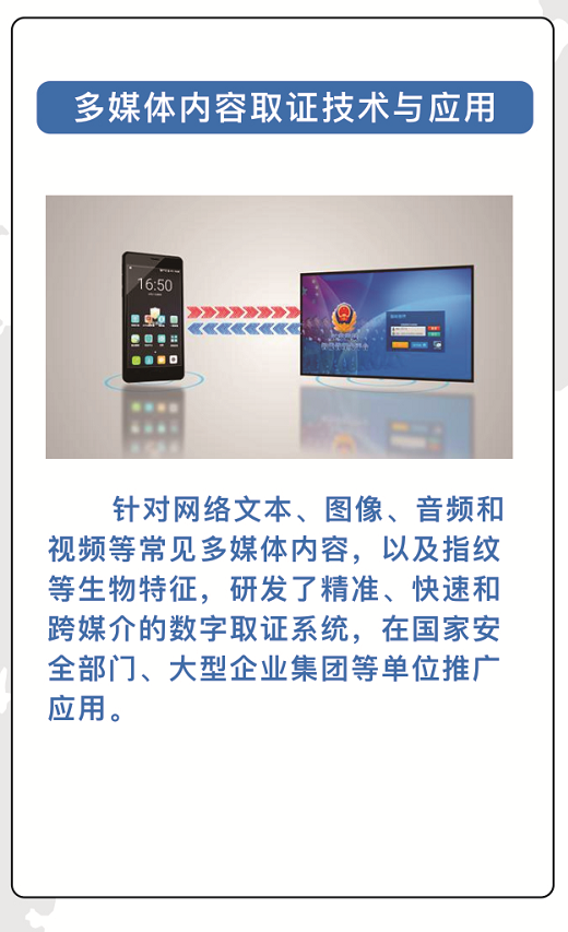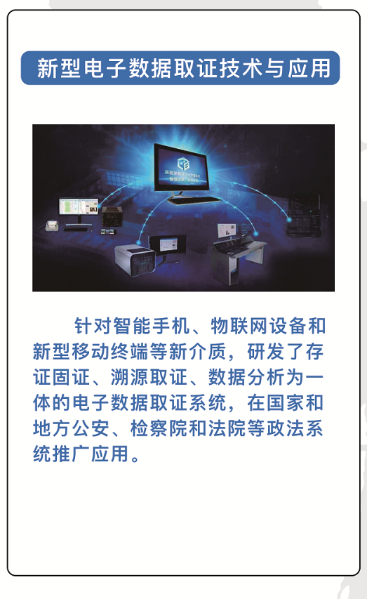 新型电子数据取证技术与应用:针对智能手机、物联网设备和新型移动终端等新介质,研发了存证固证、溯源取证、数据分析为一体的电子数据取证系统,在国家和地方公安、检察院和法院等政法系统推广应用。