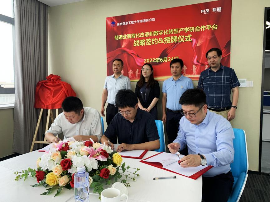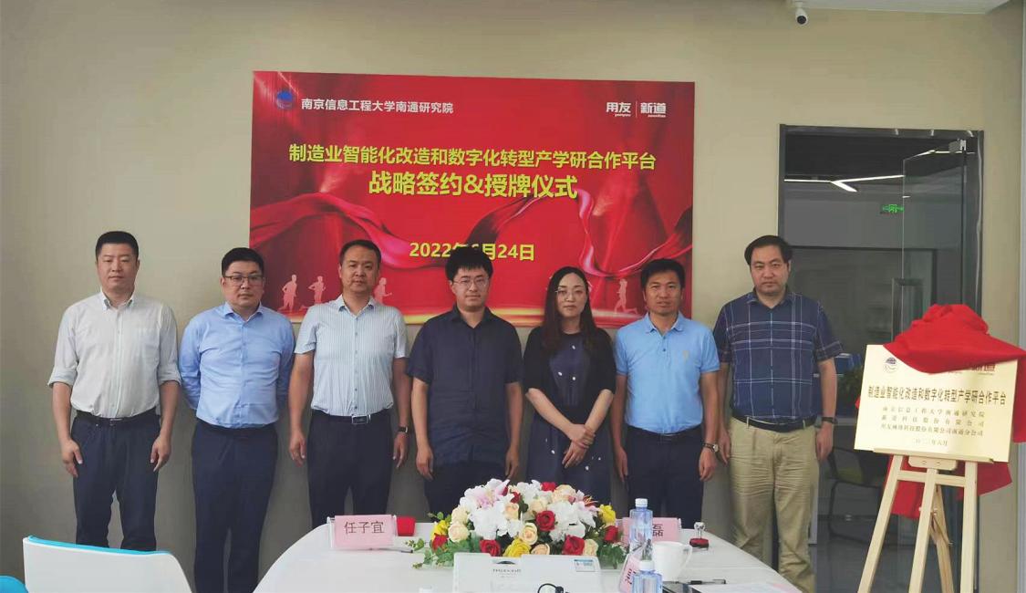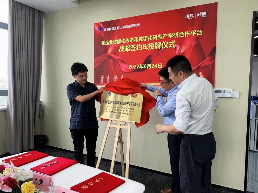 6月24日,我院与用友网络南通分公司及新道科技股份有限公司举行战略合作签约暨揭牌仪式。南通市崇川区工信局副局长陈小青、南通市崇川区科技局副局长李健、用友南通分公司总经理张磊、用友新道总经理任子宜,以及我院院长方昊、法人代表刘云平、副院长吴玉乾出席。仪式由我院院长方昊主持。