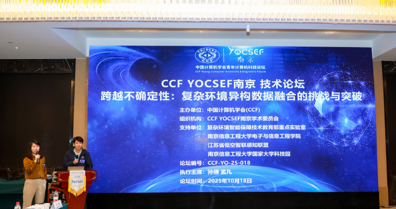 10月18日下午,“跨越不确定性:复杂环境异构数据融合的挑战与突破”技术论坛在我校成功举办。论坛由中国计算机学会(CCF)主办,CCF YOCSEF南京学术委员会承办,YOCSEF南京 AC副主席孙倩、AC学术秘书孟凡作为执行主席。论坛得到了复杂环境智能保障技术教育部重点实验室、我校电子与信息工程学院、江苏省低空智联感知联盟及我校国家大学科技园的大力支持。来自高校、科研院所及企业的40余位专家学者齐聚一堂,围绕复杂环境下异构数据融合技术的难点、解法和落地能力展开了深入交流与思辨。