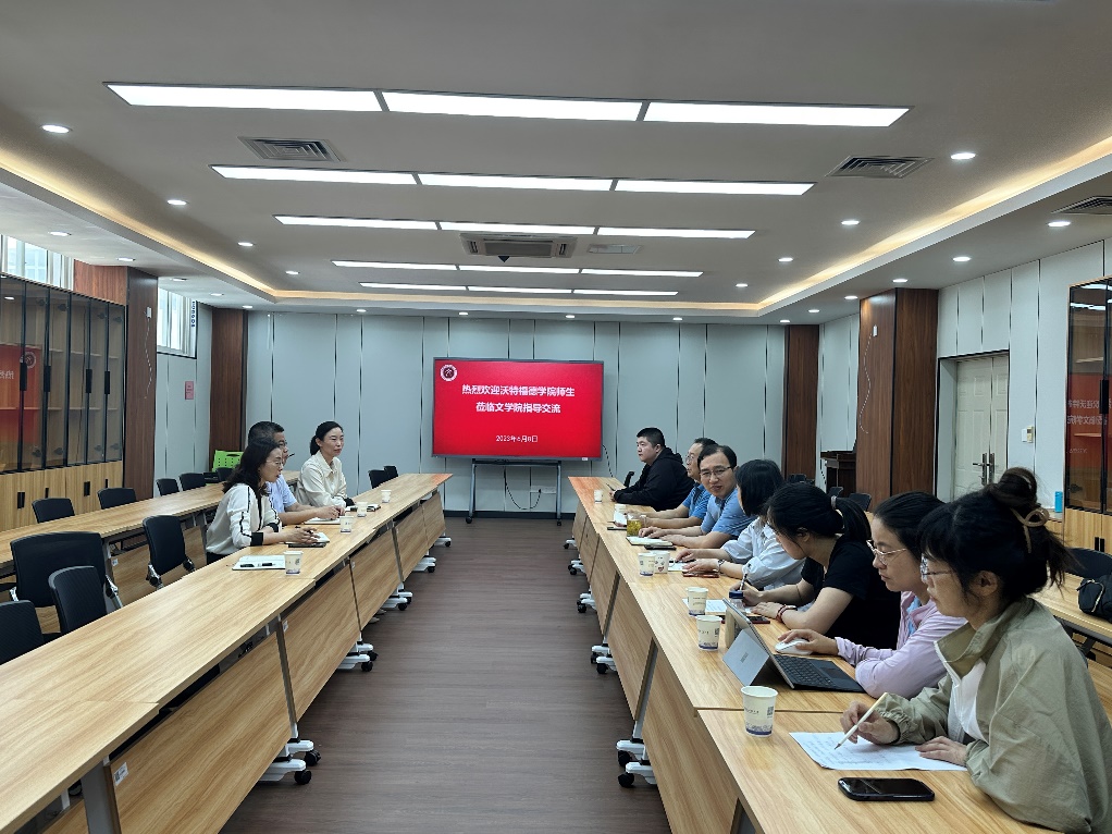 在双方的交流中,郭雨副书记首先对沃特福德学院的到访表示欢迎,并期待通过本次交流,进一步加深两院在学生培养方面的沟通,提升沃特福德学院的英语教学质量。丁媛媛副书记表示,学生语言能力提升是学院人才培养的重点难点工作之一,以期以此次调研为契机,在文学院一如既往的支持下,不断提高学生的英语水平。王保卫副院长感谢文学院对学院英语教学工作的指导与帮助。他介绍了学院实施“语言进阶支持计划”的具体情况以及学生在英语学习方面存在的困难和问题,希望能够进一步发挥学校中外合作办学学术英语教学研究中心的作用,为学生全英文专业课程学习和出国申请夯实语言基础。赵霞院长表示将全力支持和保障沃特福德学院英语教学工作,并不断提升教学质量和水平。