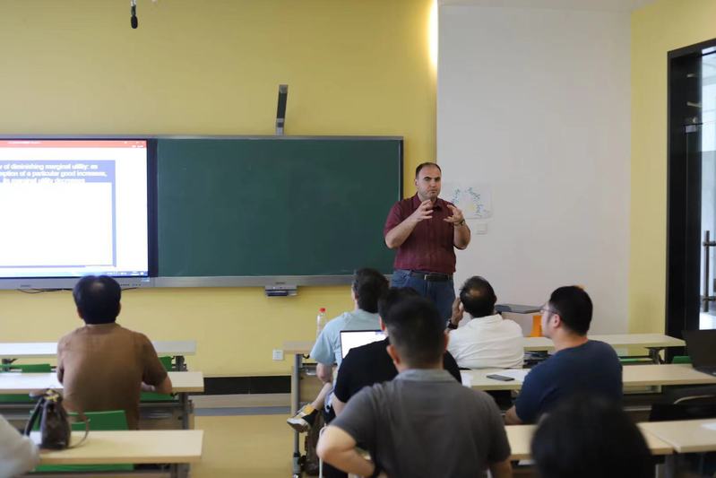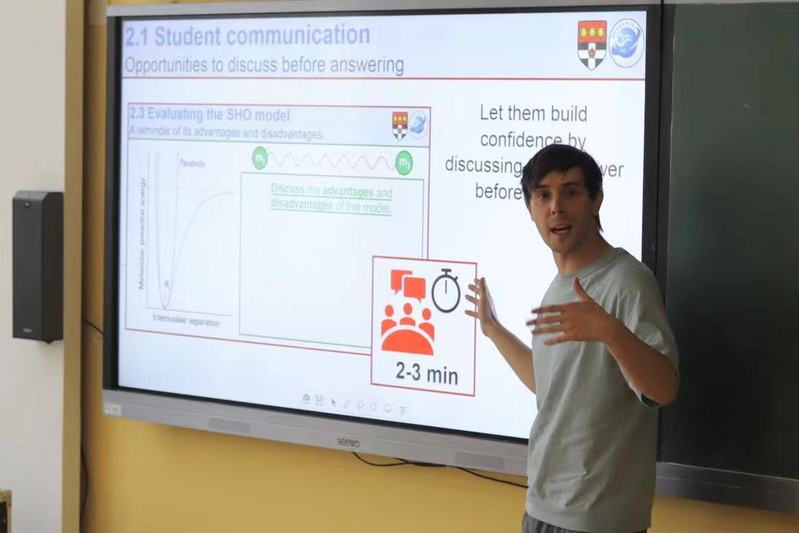 活动中,雷丁学院的两名外籍教师Georgi Dimitrov Kalchev和James StuartWright分别做全英文课程的教学示范和经验分享。Jamie博士以物理化学课程为例,从教师沟通、学生交流、课程构建和考试四个方面分享了他的全英文教学经验。他建议,在全英文课程教学中,通过复述和改写关键表述,准备词汇预览表等方式,帮助学生更好了解知识点。通过增加讨论活动,帮助学生树立用英语交流的信心。通过使用章节编号构建清晰的课程框架,帮助学生理解课程内容结构。此外,Jamie博士还介绍了全英文课程考试常用的考试结构和考题用词。George博士以中级微观经济学课程为例,进行了全英文教学示范,他建议教学中要加强与学生的互动,引导学生思考和回答课程相关问题。