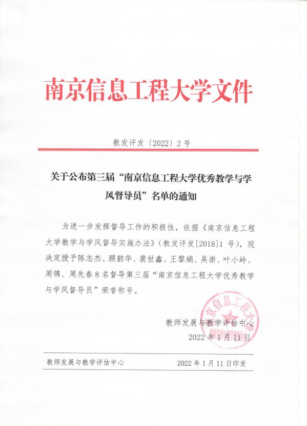 关于公布第三届“南京信息工程大学优秀教学与学风督导员”名单的通知
