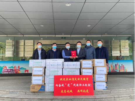 3月23日上午,校友企业南京信大云天教育向学校捐赠一批价值三万余元的医用口罩、手套、酒精、消毒液等防疫物资,助力校研究生院、保卫处、金牛湖产教融合园区等开展疫情防控工作。金牛湖产教融合园区管理委员会主任马廷淮、研究生工作部副部长王继东、保卫处消防安全科科长周航等现场接收捐赠物资。发展规划处处长、校友办公室副主任郭杨向信大云天教育董事长姚来、总经理赵强颁发了捐赠证书。