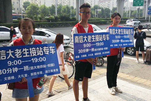 这两天,不少返校的学生惊喜地发现,一出“信息工程大学站”便看到了学校的志愿者,他们高举“南信大老生返校接站专车”的引导牌,一路引导学生坐上学校的接驳班车。这样的待遇让同学们笑言“受宠若惊”!
