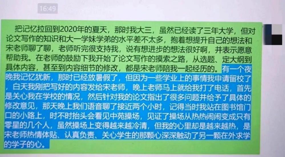 学院曾有一位同学在备战考研阶段状态欠佳,宋晓丹发现后,第一时间对其进行心理疏导,及时向学院反映这一情况,并积极联系学生家长,同时请舍友多关心照顾该学生。在宋晓丹和大家的共同帮助下,这位同学很快就恢复状态,重拾信心,后来在考研中取得了好成绩。正是宋老师的关心,让他重新走上了人生正轨!