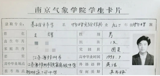 王辉就读南气院期间的学生卡片