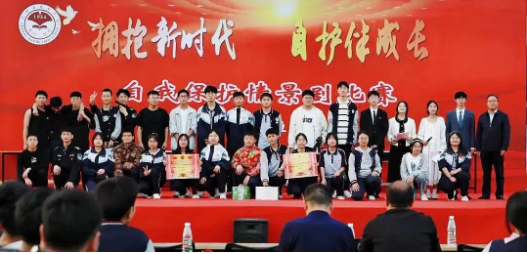 王辉(最右)与炮车中学情景剧比赛获奖选手合影