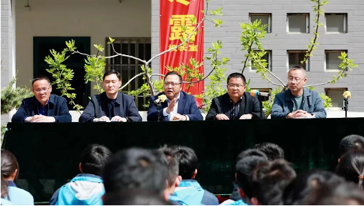 王辉(中)在炮车中学高考誓师大会上鼓励学生