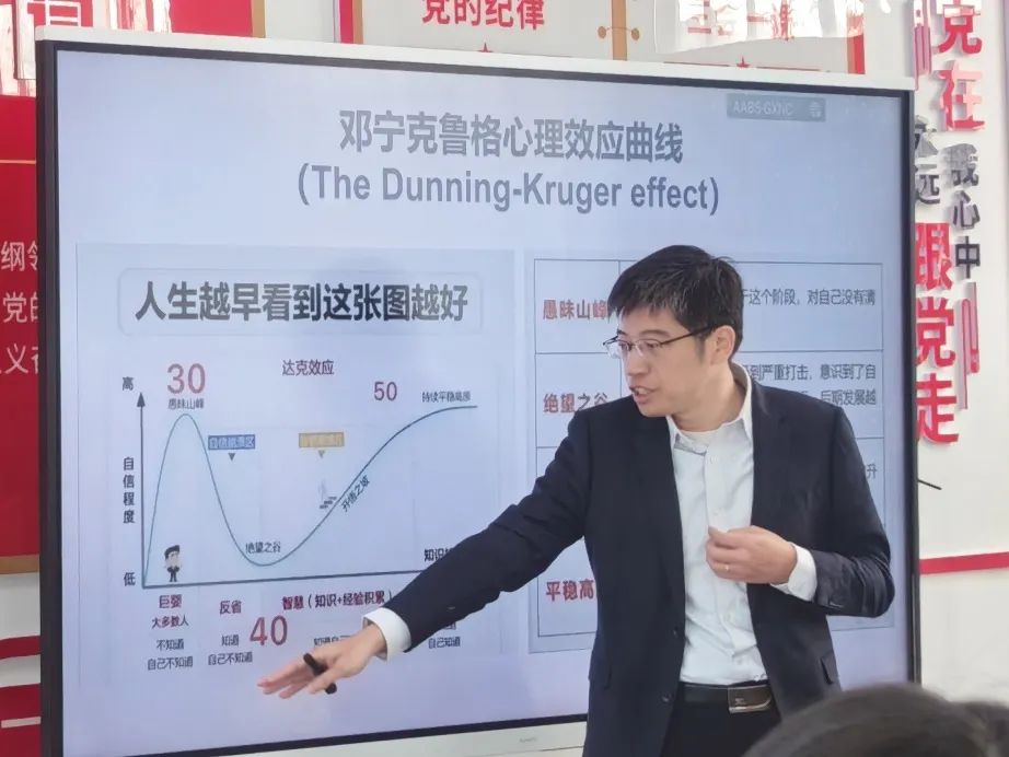 顾德明校友从职业生涯规划出发,给同学们分析如何培养就业的能力,启发同学们从校园走向社会,为同学们上了一堂生动的就业指导课。他通过“邓宁-克鲁格心理效应曲线”,提醒同学们警惕自我评估中的偏差,并通过不断学习和实践来提升自己的能力和认知水平。讲座中,他分享了自己职业生涯中的三段工作经历,勉励同学们把握时代机遇,做好生涯规划,在工作岗位上大显身手,勇攀科技高峰。