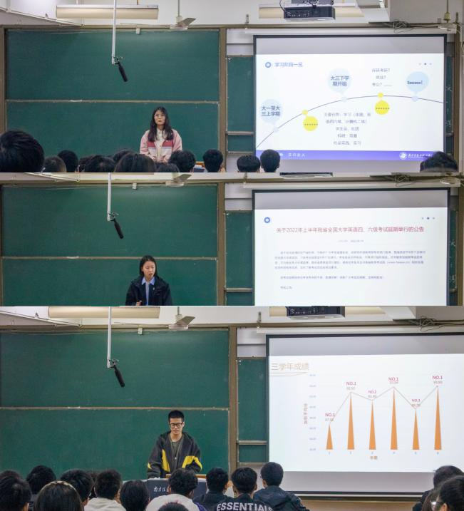 分享会现场,三位保研同学从多方面进行了学习经验分享、展示了丰富多彩的大学生活和收获,并结合大一阶段的学习任务和目标给同学们提出了中肯的建议。其中,潘晨宁介绍了高数、英语四六级的学习方法,强调了课前复习与课后预习的重要性。沈晓旭向同学们推荐了各大学习平台以扩充学习资源,并叮嘱大家要注意培养良好的学习习惯。张周旸结合自身经历,分享了自己的科研历程,详细介绍了科研、竞赛的准备及需要具备的基础能力,鼓励低年级同学了解竞赛、参与竞赛。