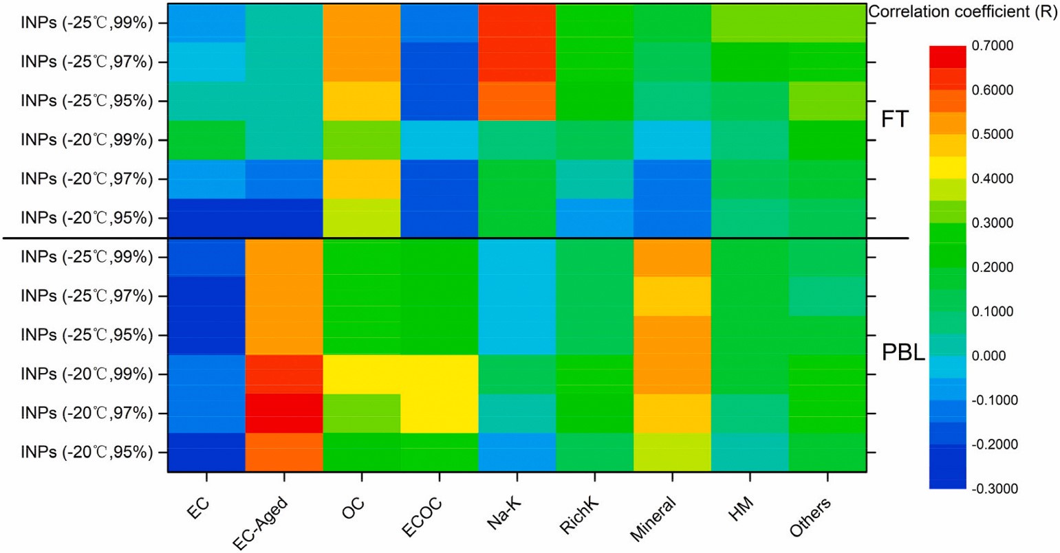 2 泰山山顶冰核与不同气溶胶组分相关性。白天冰核数浓度与老化黑碳气溶胶(EC-Aged)有着较高相关性;夜间冰核数浓度与有机气溶胶(OC)、Na-K颗粒物有较高相关性。