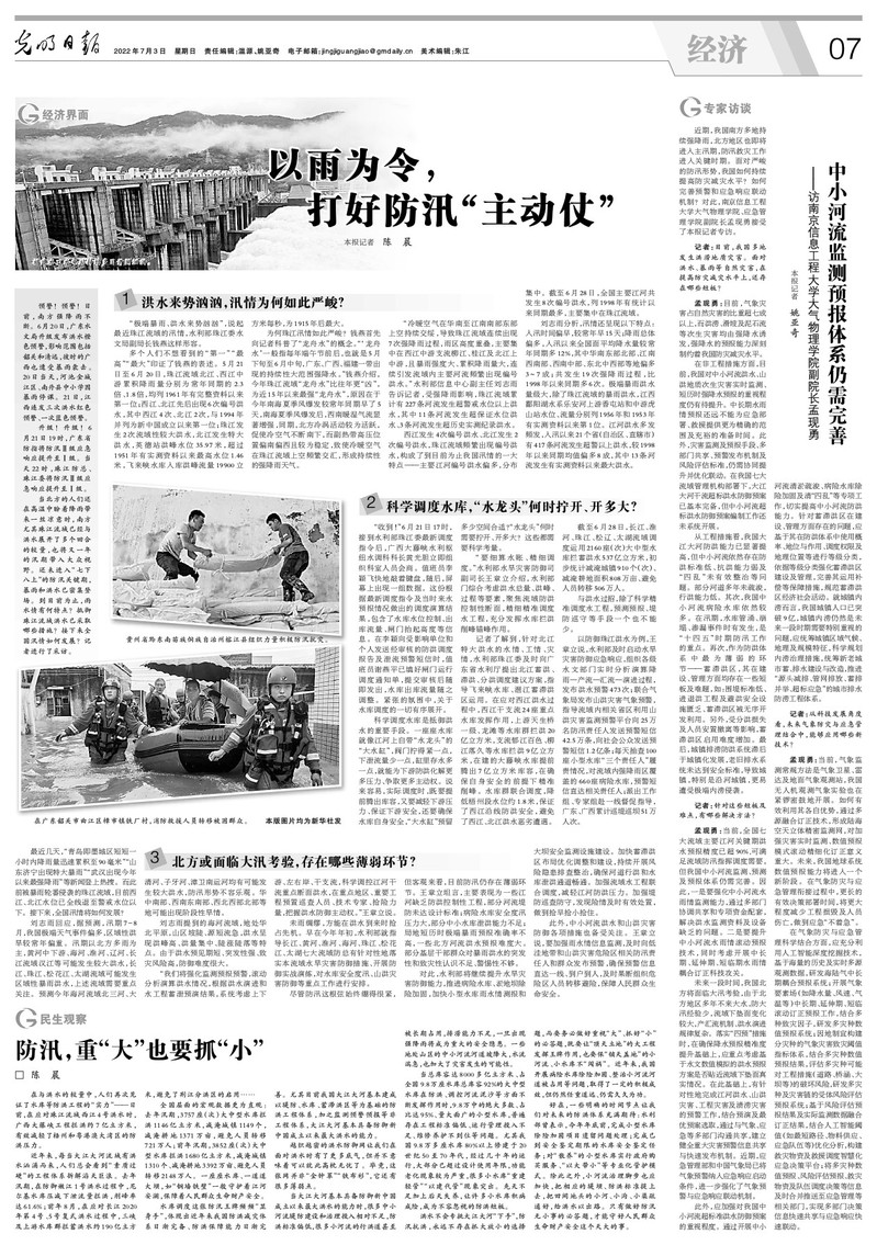2022年7月3日出版的《光明日报》刊发了对我校大气物理学院、应急管理学院副院长孟现勇的专访《访南京信息工程大学大气物理学院副院长孟现勇——中小河流监测预报体系仍需完善》,就近期我国南方多地持续强降雨,北方地区也即将进入主汛期,降雨逐渐增多,防汛救灾工作进入关键时期。面对严峻防汛形势,我国如何持续提高防灾减灾水平,如何完善预警和应急响应联动机制等问题进行了报道,全文如下: