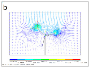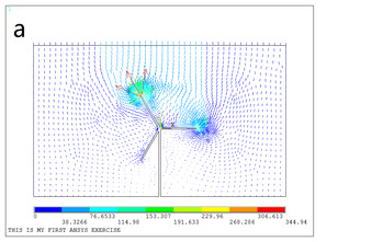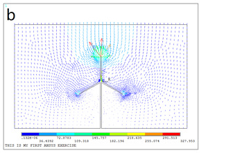 近期我院李祥超团队以风机叶片为研究对象,通过ANSYS仿真与试验室模型试验相结合的方法,进行了风机叶片电晕触发阈值的影响因素分析。将风机置入平行电容板的模型中,计算了电晕触发时风机叶片的电场和电势。风机叶片长为22cm和旋转角度为0°时电场畸变最强的发生在风机最高叶片的尖端,较低的叶片尖端也明显畸变,叶片周围的最大场强为339.15 kV /m(如图1a)。电场的方向为平行电容板的下极板指向上极板,最高叶片尖端电场方向与环境电场方向基本一致,但在电场强度上发生了很大畸变,在较低叶片的强度上在方向上发生了较大的畸变,畸变后的电场方向基本上与原环境电场方向垂直(如图1b)。