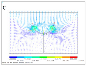 图2 风机叶片长为22cm时不同角度电场矢量图:(a) 旋转角度为30° (b) 旋转角度为45° (c) 旋转角度为60°