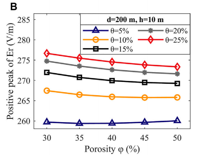 图1:(A)不同孔隙度设置时,含水量变化对水平电场峰值的影响。(B)不同含水量设置时,孔隙度对水平电场峰值的影响