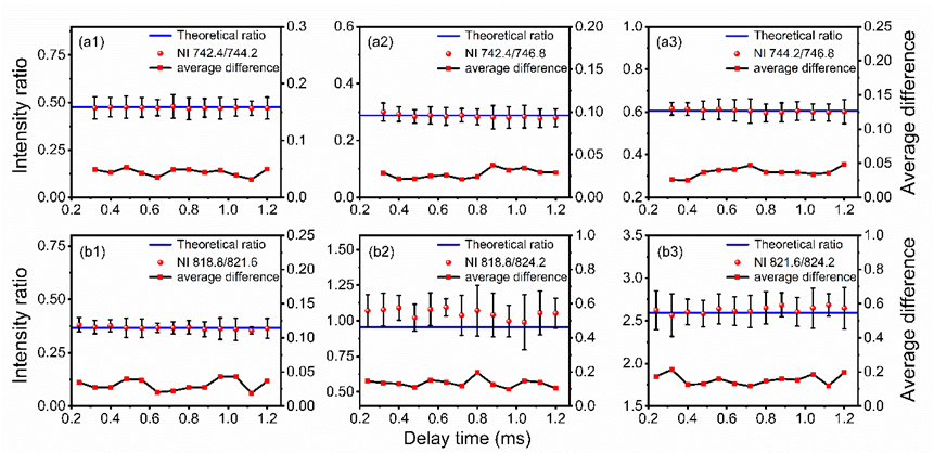 图2 NI [742.4, 744.2, 746.8 nm] 和 NI [818.8, 821.6, 824.2 nm]多重态测量谱线强度比和理论计算gA值之比