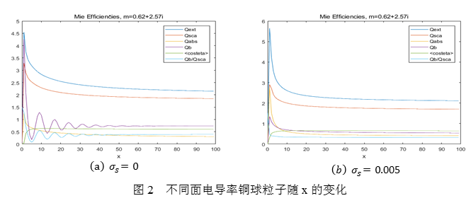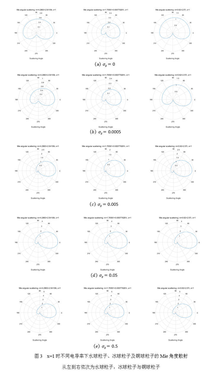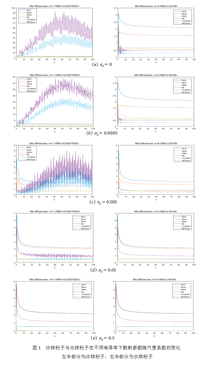 王金虎教授团队基于Mie散射理论推导分析了带电球形粒子的散射特性,给出散射系数与表面电导率的关系,计算了不同面电导率粒子与非带电粒子的散射角,计算表明:对金属类粒子,带电后的散射影响不大;但带电介质类粒子如水球、冰球粒子,面电荷使面电导率达到一定量级时,对散射特性有明显的影响。与水球相比,冰球的散射系数振荡现象处于粒子尺度参数更大值,振幅更强,而当面电导率很大时,即携带更多电荷量时,两者散射效率近似相等,与同大小的金属球形粒子的散射效率接近。随着面电导率的增加,散射系数发生较大变化,但当电导率达到一定值时,散射系数趋于恒定。相对非带电粒子的散射,带电后粒子的散射系数减小,散射能量沿不同方向重新分布,后向散射强度增强,其他方向的散射强度减小。当冰球粒子与水球粒子面电导率大到一定程度时,其散射特性都接近等大金属粒子的散射特性。