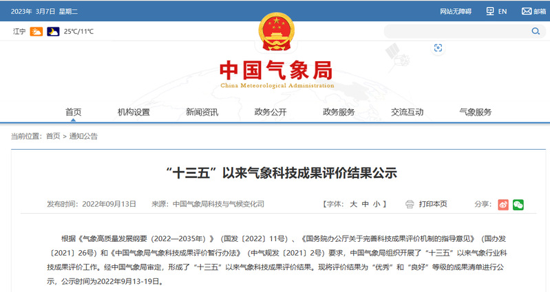 根据《气象高质量发展纲要(2022—2035年)》(国发〔2022〕11号)、《国务院办公厅关于完善科技成果评价机制的指导意见》(国办发〔2021〕26号)和《中国气象局气象科技成果评价暂行办法》(中气规发〔2021〕2号)要求,中国气象局组织开展了“十三五”以来气象行业科技成果评价工作。经中国气象局审定,形成了“十三五”以来气象科技成果评价结果。这也是气象部门首次开展行业科技成果全面评价,在择优推荐、专家评审和综合评价的基础上,百项成果从面向气象行业征集的251项成果中脱颖而出,涵盖天气预报、气候与气候变化、综合气象观测、气象信息、气象服务与应用气象、基础研究等领域,为气象高质量发展注入创新动能。