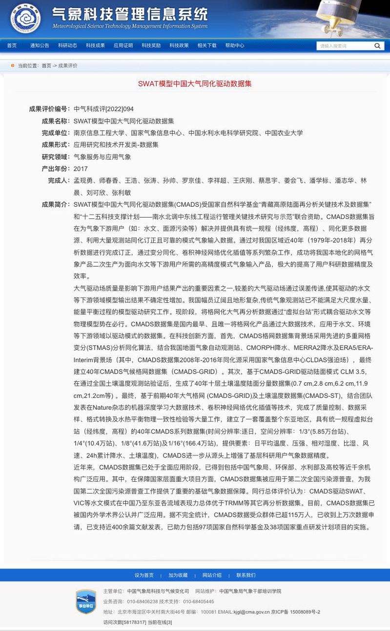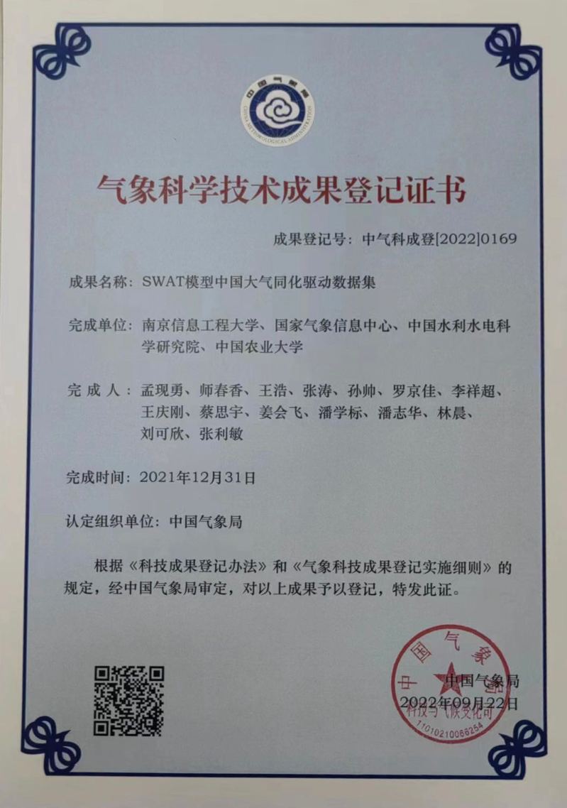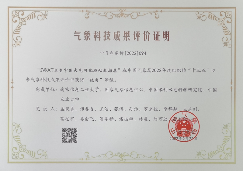 近日,我院收到中国气象局发来的气象科技成果评价证书(编号:中气科成评[2022]094)。由我院孟现勇教授牵头负责,中国气象局国家气象信息中心、中国水利水电科学研究院及中国农业大学等单位参与研发的“SWAT模型中国大气同化驱动数据集(The China Meteorological Assimilation Driving Datasets for the SWAT model ,CMADS)”获评“十三五”以来气象行业优秀成果。