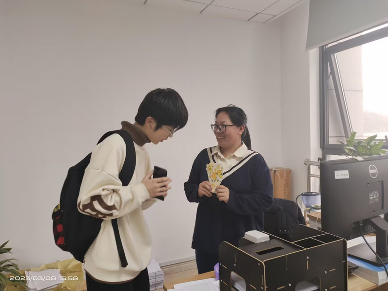 活动分为两部分,第一部分是“贺卡谢师恩”,同学们将真挚的祝福撰写在精美的贺卡上,并送予学院各位女老师,以表达对老师的节日祝福。第二部分是“永生花手工DIY”,师生齐动手,一花一草,通过剪接、绑枝、粘贴的方式,将爱与创意融入手作,亲手打造造型各异的专属作品。活动中,同学们感受到DIY制作带来的乐趣,体会到了艺术创造的美丽,对民族传统工艺的制作过程有了更切实的了解。
