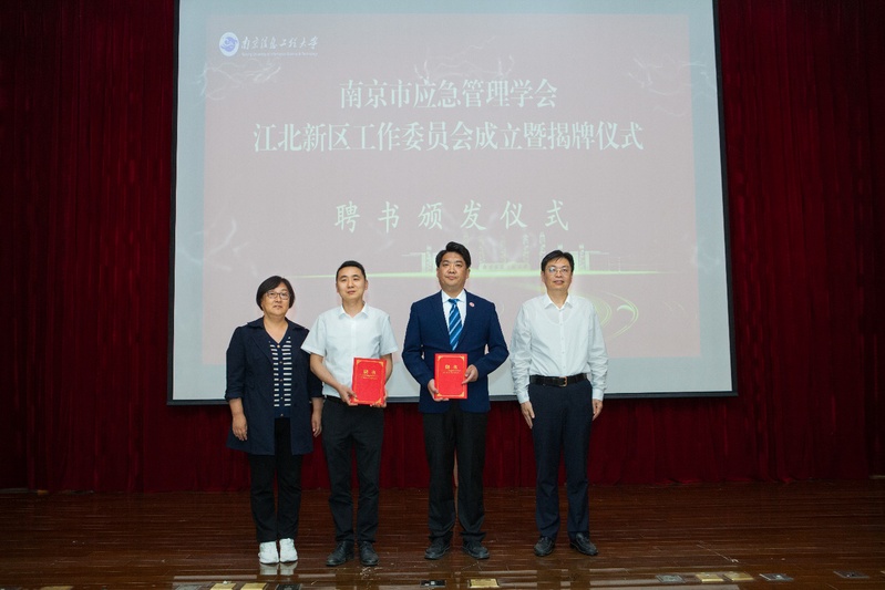 随后,主持人商建宣读由南京信息工程大学公共安全治理研究院院长、应急管理学院副院长孟现勇担任南京市应急管理学会江北新区工作委员会主任委员,由应急管理学院院长助理王金虎担任秘书长。周乃贵与商建分为主任委员及秘书长颁发了聘书。此后,会议还宣布了副主任委员单位名单并颁发了证书,南京市应急管理学会江北新区工作委员会及相关企业实践就业基地共建揭牌同时揭牌。