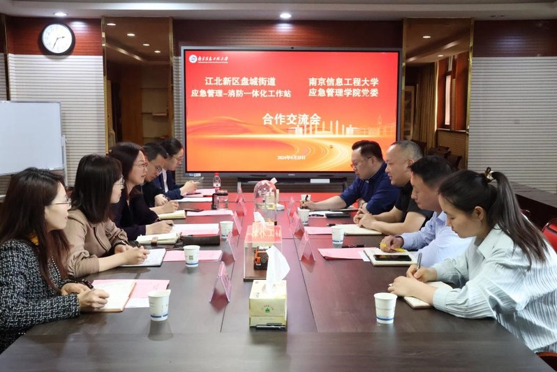 为进一步加强应急管理领域的实践能力,提升社区应对突发事件的综合处理水平,4月25日,盘城街道应急管理——消防一体化工作站站长骆宏和、常务副站长郑波以及永丰社区党总书记、居委会主任彭荣伟来我校开展合作交流。应急管理学院党委书记成芳、党委副书记兼副院长徐海波、副院长顾湘、公共安全治理研究院副院长张胜玉、学生办公室辅导员黄欣慧出席了本次会议。会议由徐海波主持。