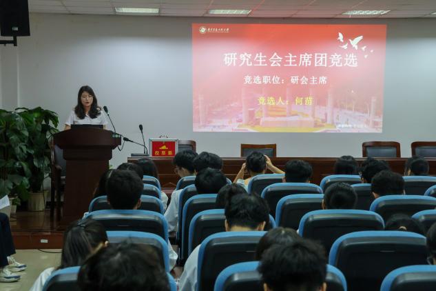 随后,学院第二届研究生会主席团和第三届团学组织主席团候选人进行竞聘发言。他们依次上台,围绕个人介绍、工作总结、竞选优势、未来展望四个方面展开自述。