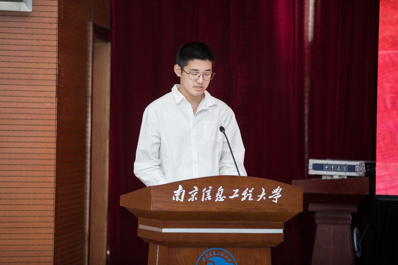接着,教师代表师正、老生代表戴乐飏和新生代表李文理依次上台发言。师正通过日常教学实际,分析了现阶段大学生的学习问题以及改善方法。他提倡同学们要积极参与老师的科研项目,拓宽视野、增长见识。戴乐飏分享了自己的学习心得,建议同学们要学会思考,主动找到自己成长道路,并为之坚持。李文理讲述了自己对“应急管理+环境工程”双学位专业的理解和认识,并从不同角度阐述本专业的重要性。她呼吁所有新生,努力学习专业知识,未来为应急领域的发展贡献力量。