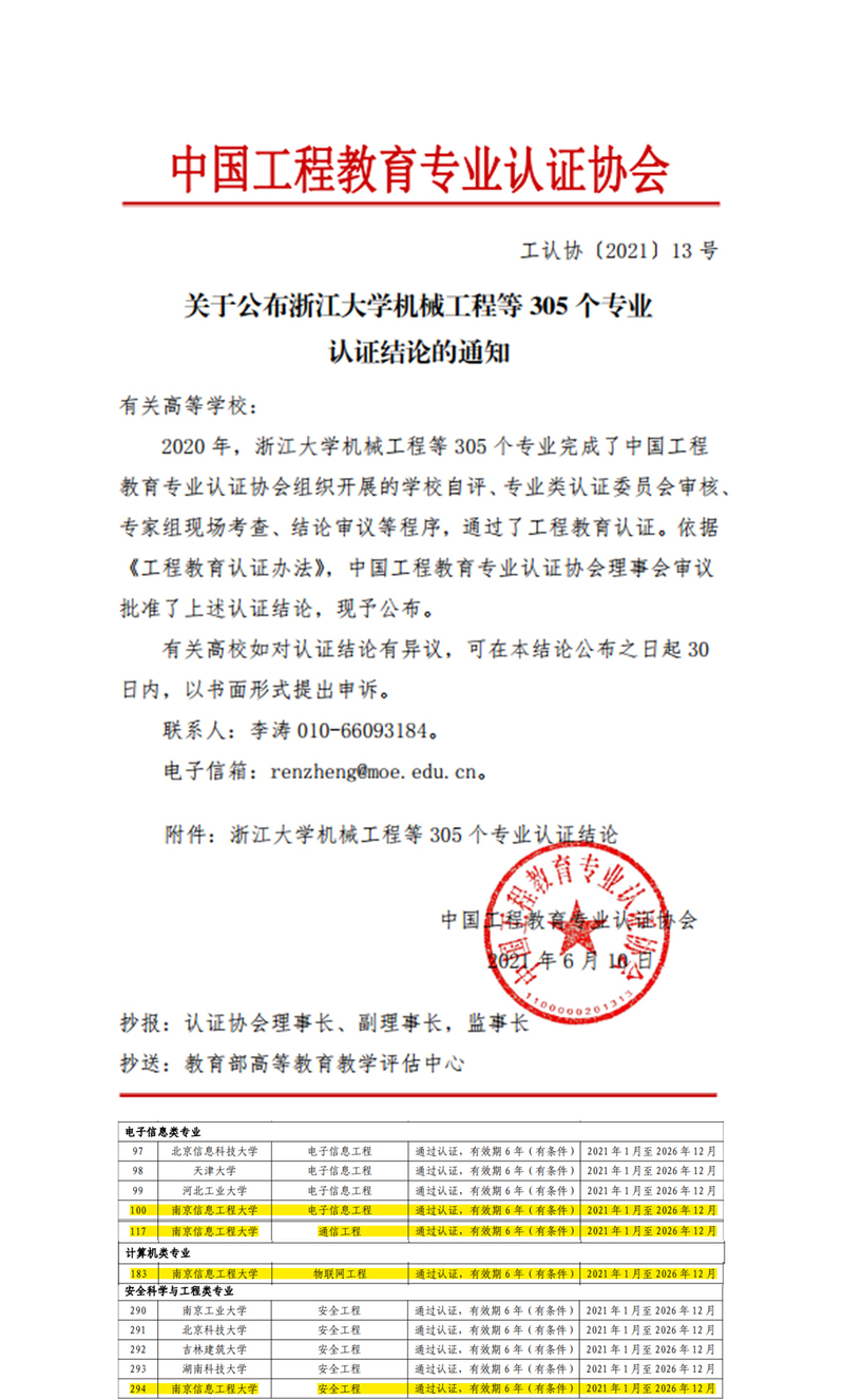 目前,学校共有工科专业30个,其中符合工程认证条件的专业有17个。至此,我校环境工程、材料物理、计算机科学与技术、测绘工程、电子信息工程、通信工程、安全工程和物联网工程等8个专业已通过中国工程教育专业认证;测控技术与仪器,光电信息科学与工程、自动化、电气工程及其自动化、电子科学与技术、遥感科学与技术、软件工程、信息工程等8个专业已获认证受理。