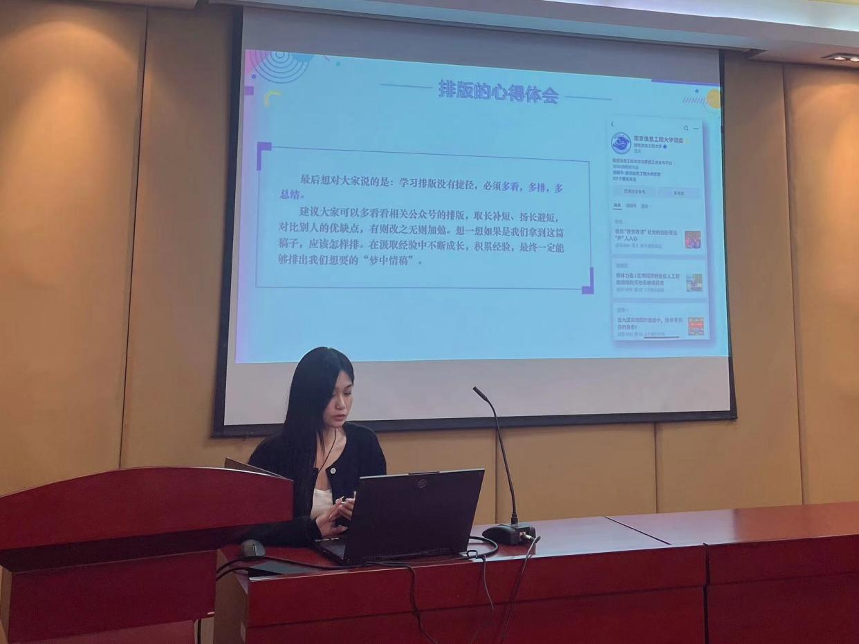 随后,黄佾慈就微信公众号排版作了交流与分享。她向各位同学讲述了排版的基本逻辑及风格选择,并根据排版的基础格式向干事们提出明确要求。她强调,好的排版应突显主旨内容,并做到让读者视野清晰,印象深刻。
