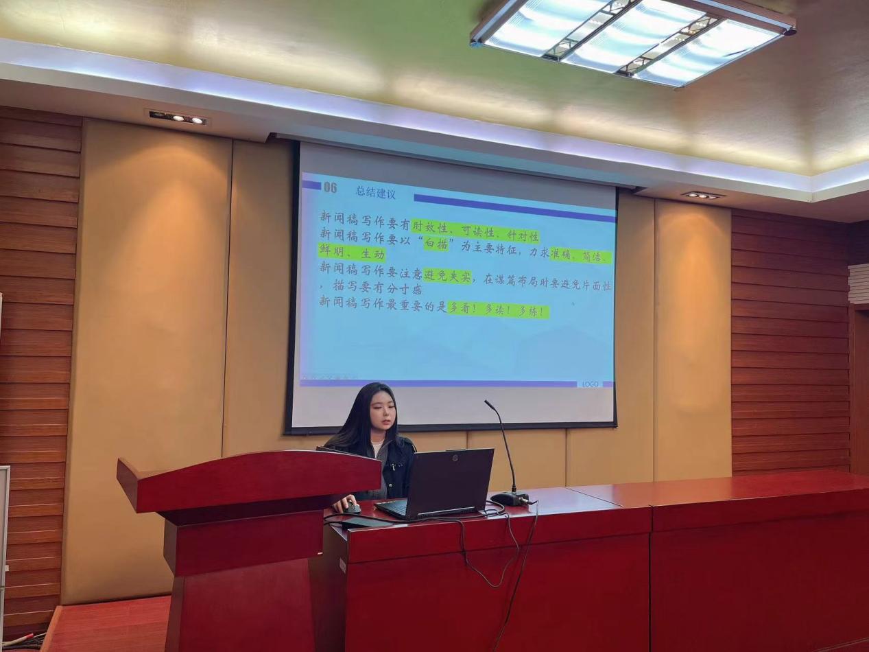 余温泽以“如何写好一篇新闻稿”为题,向各部门同学讲述了什么是新闻稿,并对如何撰写新闻稿提出明确要求,按照新闻稿“标题、导语、主体、结语”四部分内容详细介绍了撰写的注意事项合新闻稿的格式。