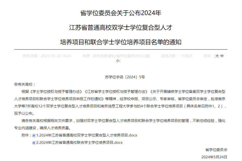近日,江苏省学位办公布了2024年江苏省普通高校双学士学位复合型人才培养项目和联合学士学位培养项目名单,我院成功获批“应急管理+环境工程”双学位复合型人才培养项目。