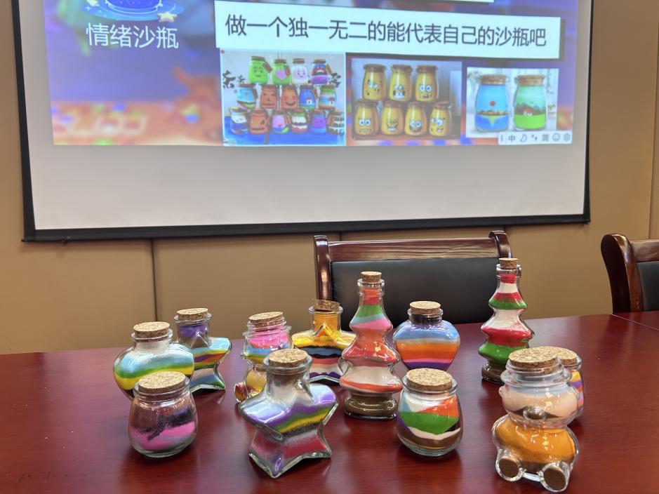 最后,同学们亲手制作了情绪沙瓶和吧唧作为纪念。大家通过想象将情绪实体化,用不同颜色代表不同情绪,制作出了独属自己的情绪沙瓶。这些手工作品不仅展示了研究生们的创意和才华,更是情绪管理成果的生动体现。