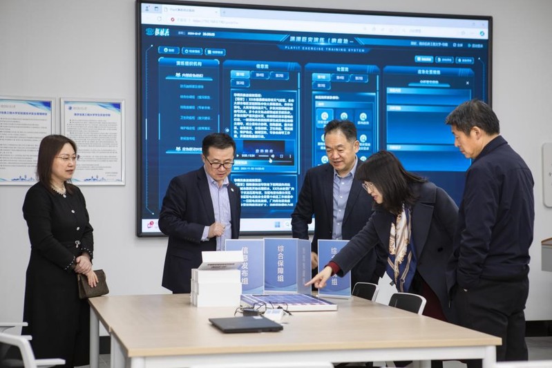 江北新区应急管理局一行还参观了学院教学实验室。在参观过程中,他们对学院教学设施和实验资源表示了高度赞赏,还与学院教师就如何进一步加强实验室资源的共享和利用进行了探讨,期望能够为双方的合作提供更多实际操作的平台和机会。