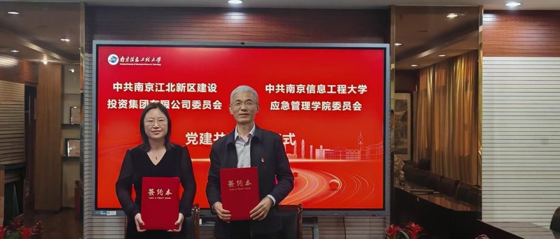 2025年3月25日,应急管理学院与南京江北新区建设投资集团有限公司党建合作签约顺利举行。参加此次签约仪式的有南京江北新区建设投资集团有限公司党委委员、纪委书记李杰以及党群工作部部长赵文雅、安全环保部部长姜卫、党群工作部党务员万书婷、安全环保部安全管理员程亮,南京市应急管理学会江北新区工作委员会副主任杨文渊、办公室主任纪建华,南京信息工程大学应急管理学院党委书记成芳、党委副书记兼副院长徐海波、副院长顾湘、安全工程系支部书记师正、本科生党支部书记黄欣慧。共建签约仪式由徐海波主持。