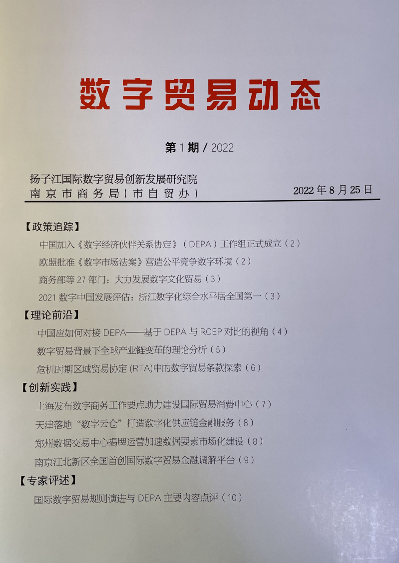 《数字贸易动态》的主编由商学院李子豪副教授担任。目前常设四个栏目:政策追踪、理论前沿、创新实践和专家评述等。其中,政策追踪栏目,密切跟踪商务部、国家发改委、各地商务厅、联合国贸发会和WTO等国内外机构关于数字贸易领域的最新政策部署。理论前沿栏目,搜集国内外数字贸易研究领域的前沿成果进行观点摘编。创新实践栏目,整理总结各地在数字贸易领域具有典型示范效应的创新实践案例进行介绍。专家评述栏目,主要邀请国内数字贸易的重要专家、扬子江国际数字贸易创新发展研究院的专家,对数字贸易领域的重要问题、热点话题进行分析点评。本刊第1期专家评述栏目,研究院院长乔均教授以《国际数字贸易规则演进与DEPA 主要内容点评》为题对国际数字贸易规制演变进行了梳理和点评。
